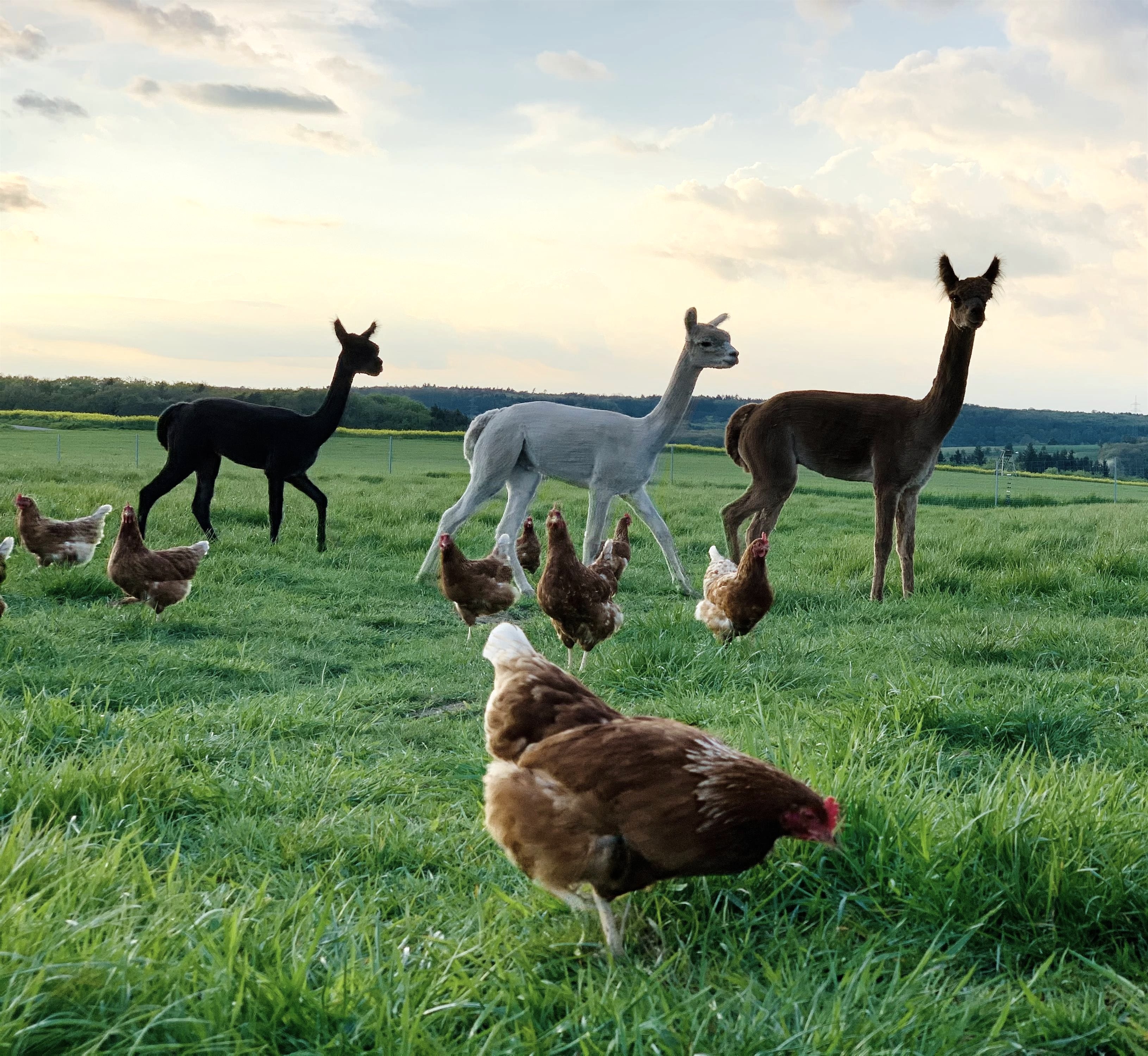 Aus dem großzügigen Garten genießt ihr einen herrlichen Weitblick über unsere großen Alpaka- und Hühnerweiden hinweg bis über das Kylltal mit seinen Wäldern und Wiesen.