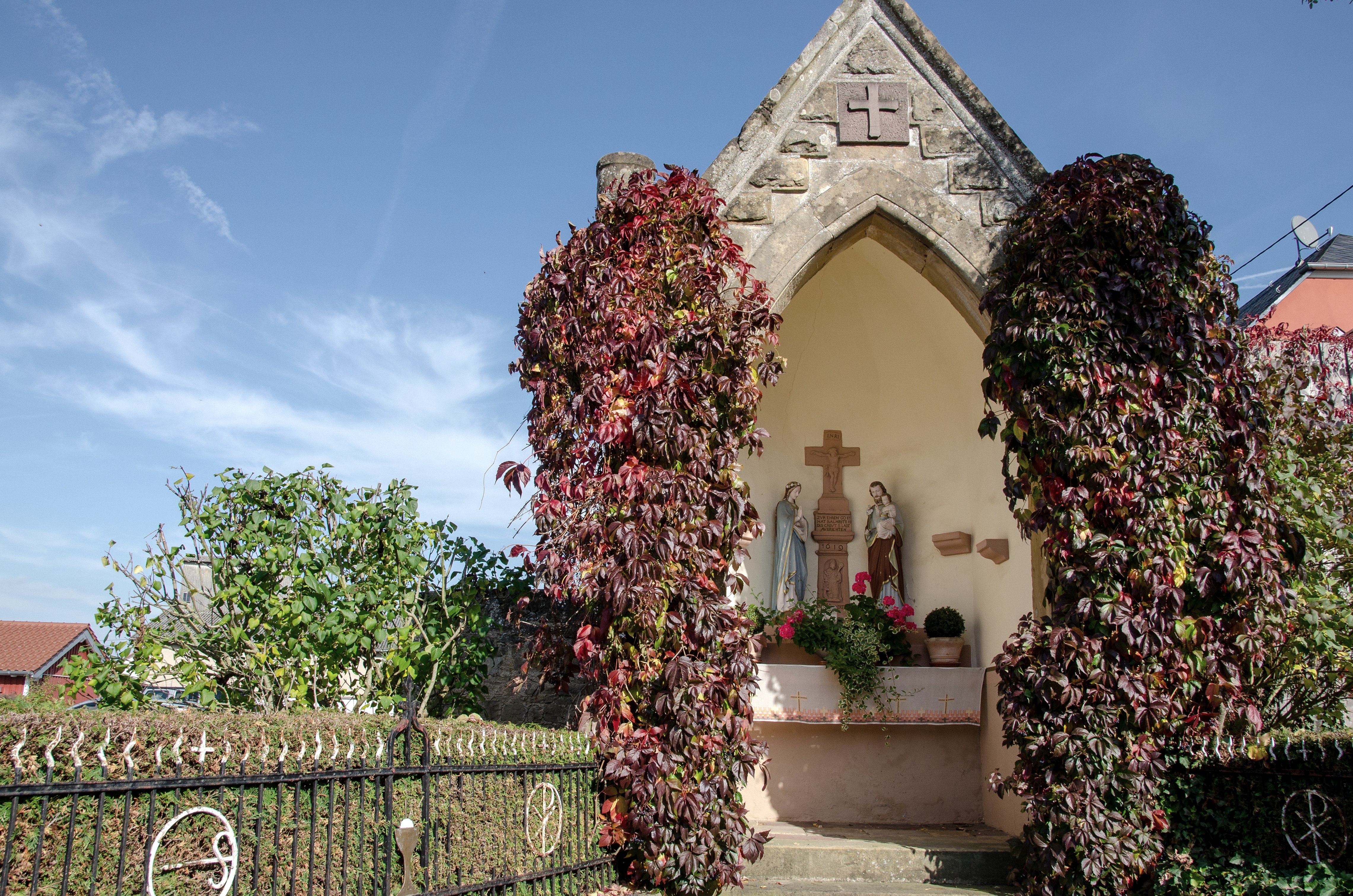 Some people wonder where the signs with the holly leaf and the number 71 lead to. You simply have to follow them. From Messenweg via Holsthumer Straße, cross the Nims and turn into Burgweg. There the signs lead along the foot of the Wolsfelder Berg for a while until the path climbs the mountain in serpentines. At the top of the plateau there is an opportunity for a wonderful view of the Nimstal and Wolsfeld, and then you meet the path that leads to the Wolsfelder Berg district. A detour of a few steps is worthwhile up to the Hubertus cross.