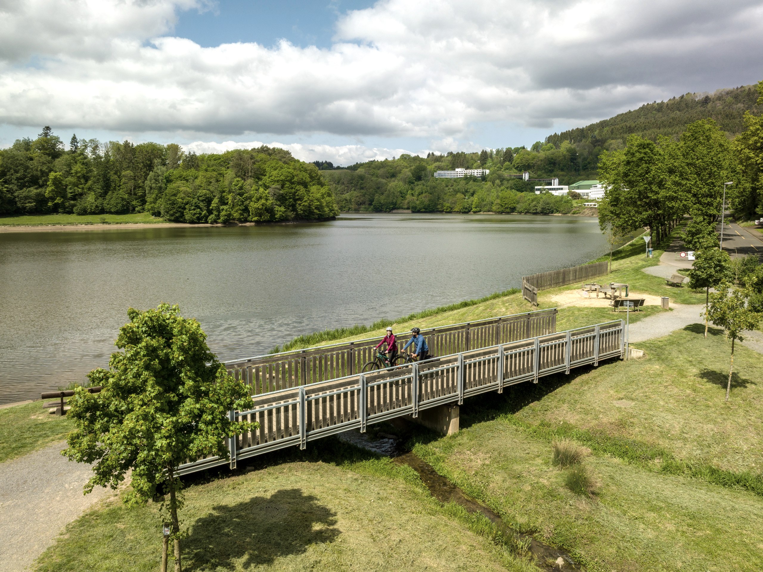The Prüm Valley Cycle Route follows the second longest river in the Eifel from start to finish. The route does not always run evenly along the valley floor, favouring instead a variety of uphill and downhill paths. For this reason, we recommend that you tackle the route from the south. The route starts in Minden, where the Prüm flows into the Sauer. The path continues through the Lower Prüm Valley, past the majestic railway viaducts in Menningen and Irrel mill, until it reaches the climatic spa town of Irrel. The Siegfried Line Museum, the Irrel waterfalls, the Teufelsschlucht, or Devil’s Ravine, and the Nature Discovery Centre are all nearby and offer opportunities to take a breather. A few kilometres upstream at Holsthum, an incredible view awaits you. At harvest time, you can’t miss the rich green hops growing several metres high. Local hop grower Dick is happy to give you an insight into the secrets of this fine crop. At Biersdorf, quite a bit further down the road, the Bitburger Stausee reservoir offers you the chance of a rest on the waterside promenade. Next, visit Hamm Castle, the biggest of the Eifel castles which is still inhabited, where you can explore the fortification that dates from the late Middle Ages. Cycling through Waxweiler, Lünebach (Eifel zoo) and Pronsfeld, you will eventually arrive in the monastery town of Prüm, where the grave of Lothar I lies in the St Salvator basilica.