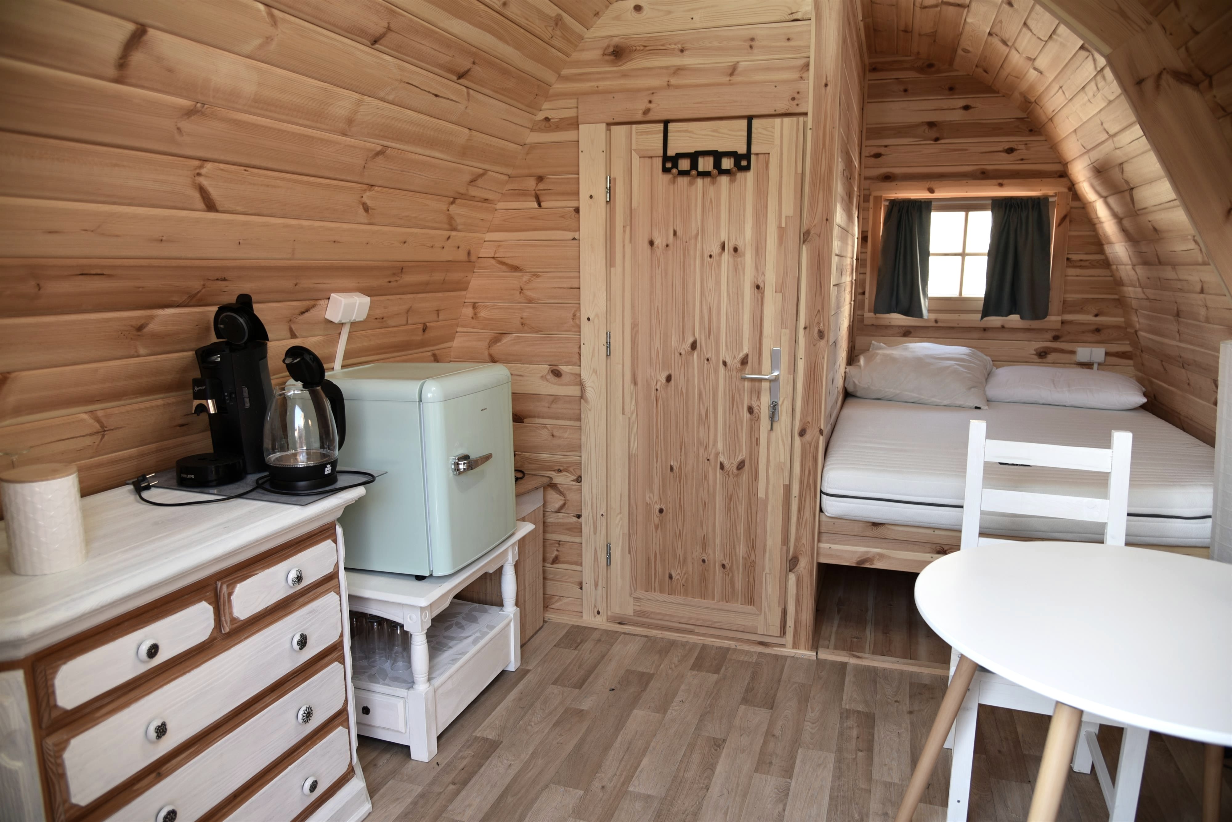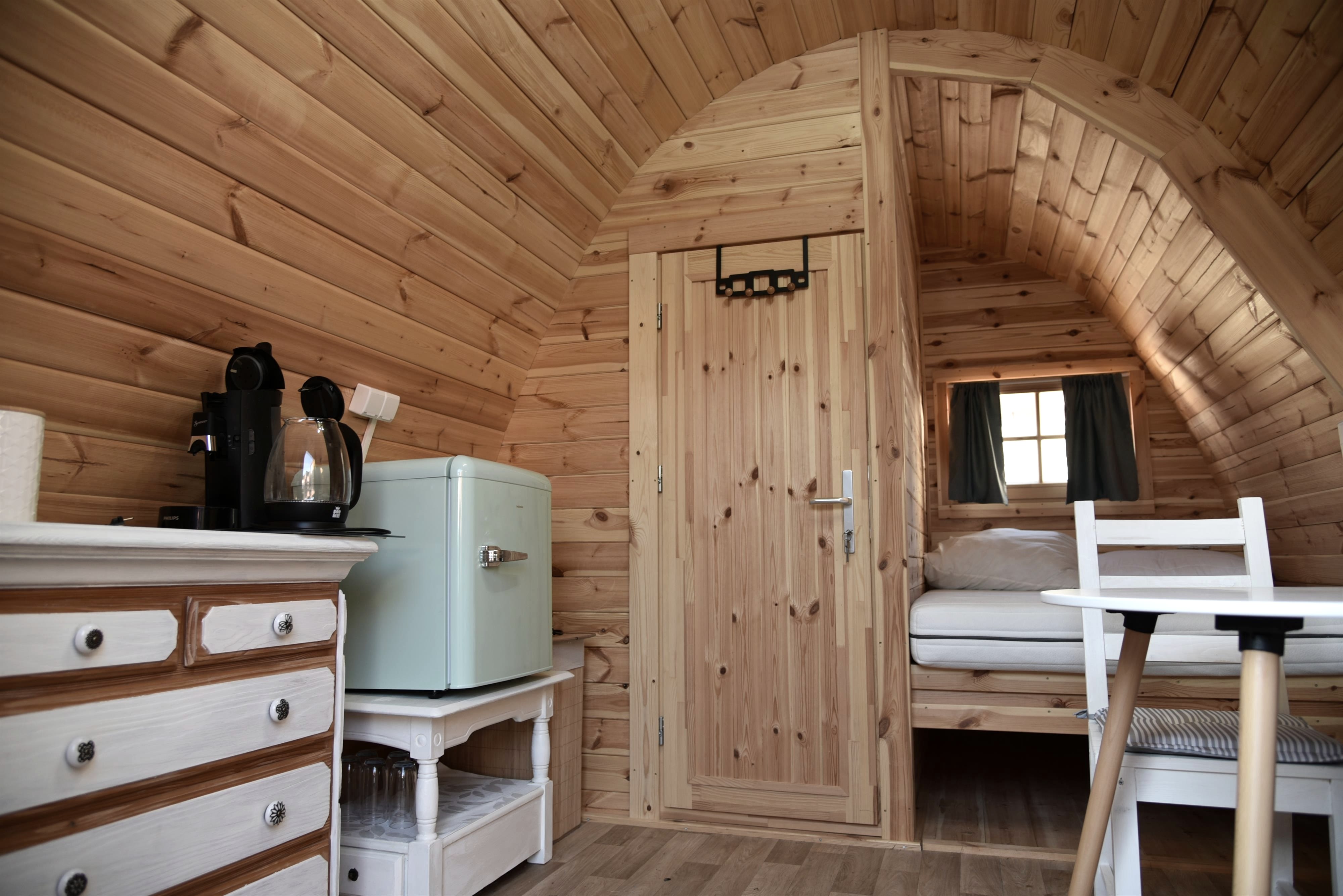 Two spacious camping pods with double beds await you upon arrival. A separate room with toilet and sink is also integrated. The tea kitchen with refrigerator, coffee machine, a table with two chairs is also part of the furniture. A sanitary building with a shower and toilet is just a few steps away.