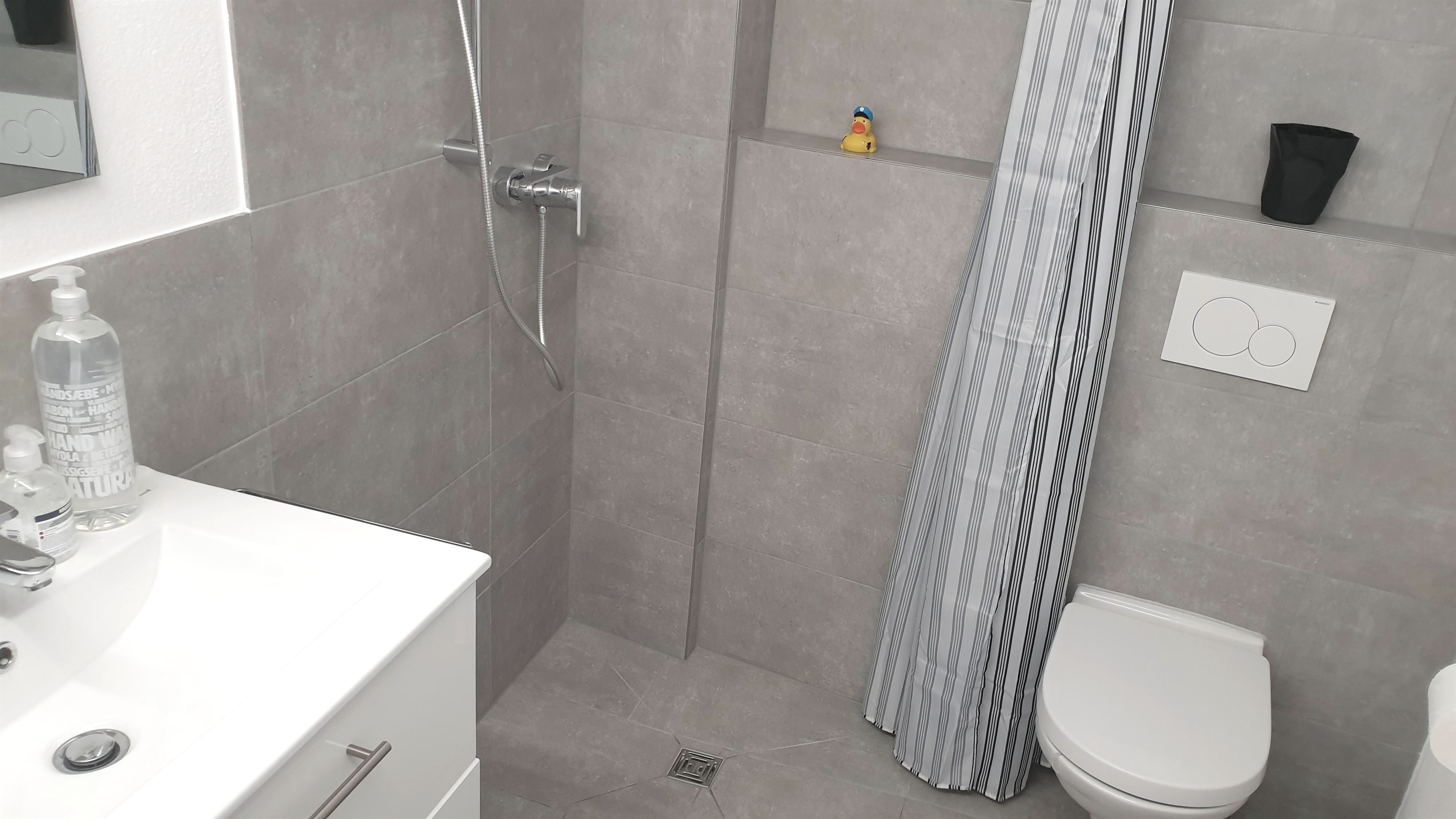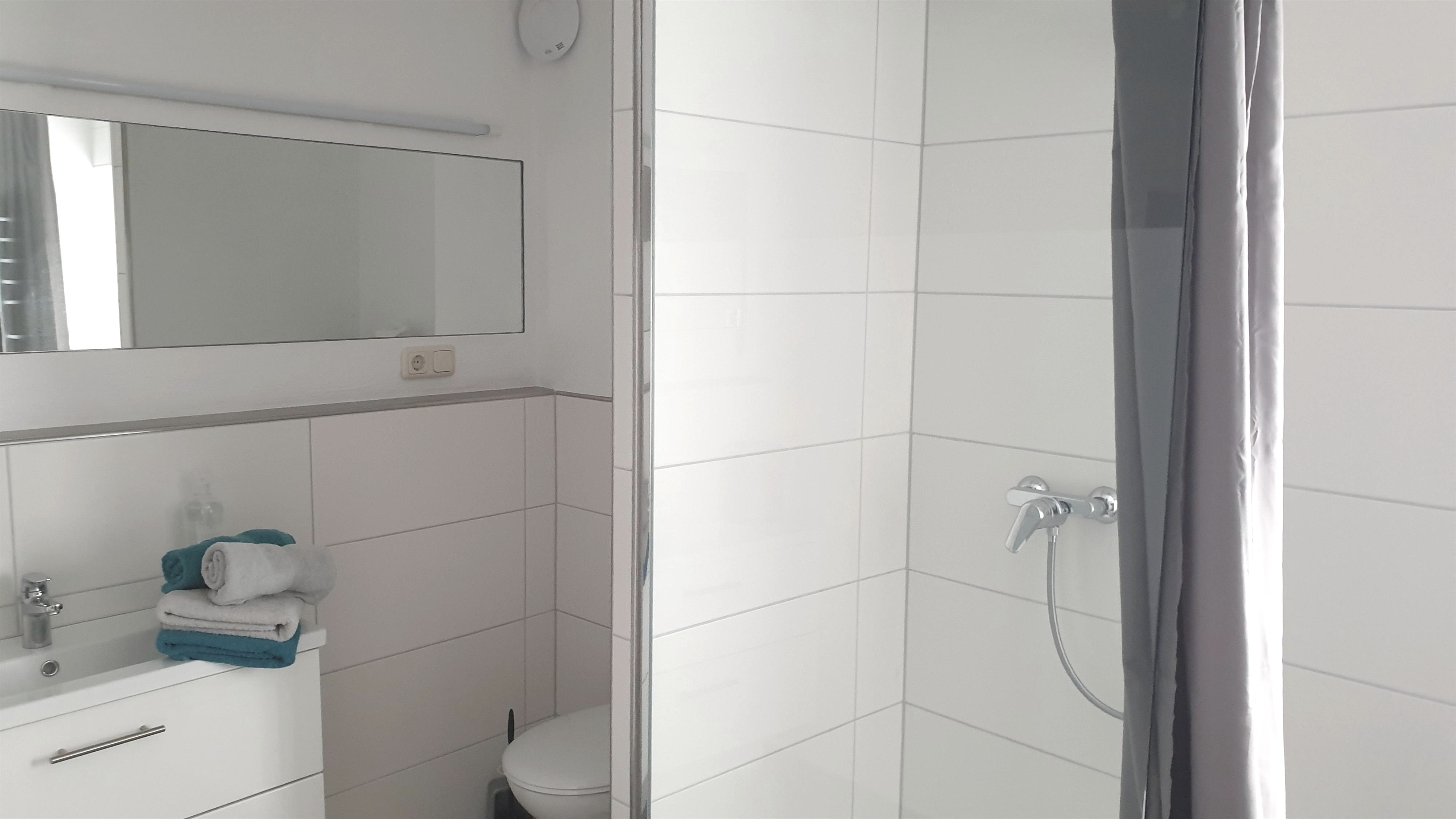 On the ground floor is a kitchen with a dishwasher and a capsule coffee machine, a dining room with a flat-screen TV, and a full bathroom with a standing shower. If required, you can park your bicycles in the spacious hallway. There is also a washing machine and a drying rack.