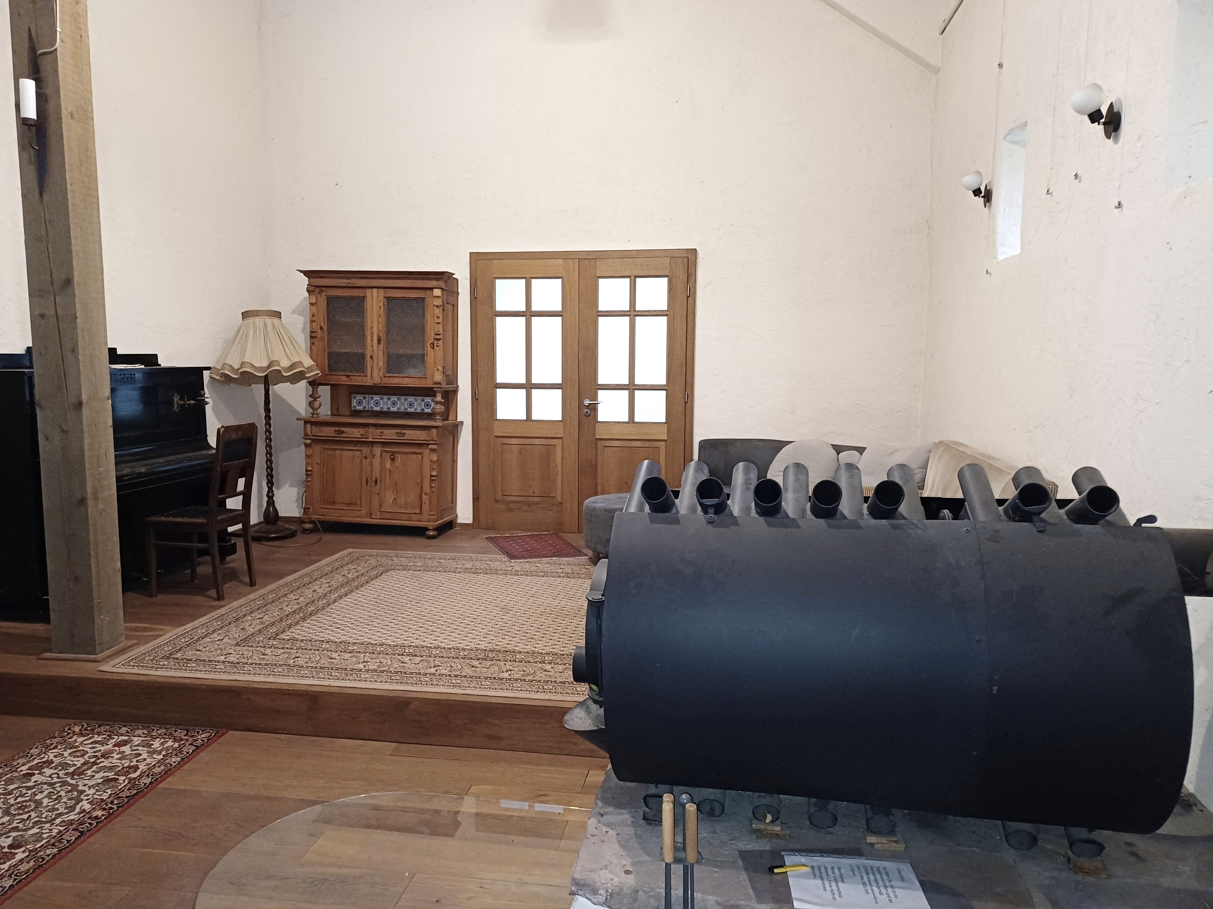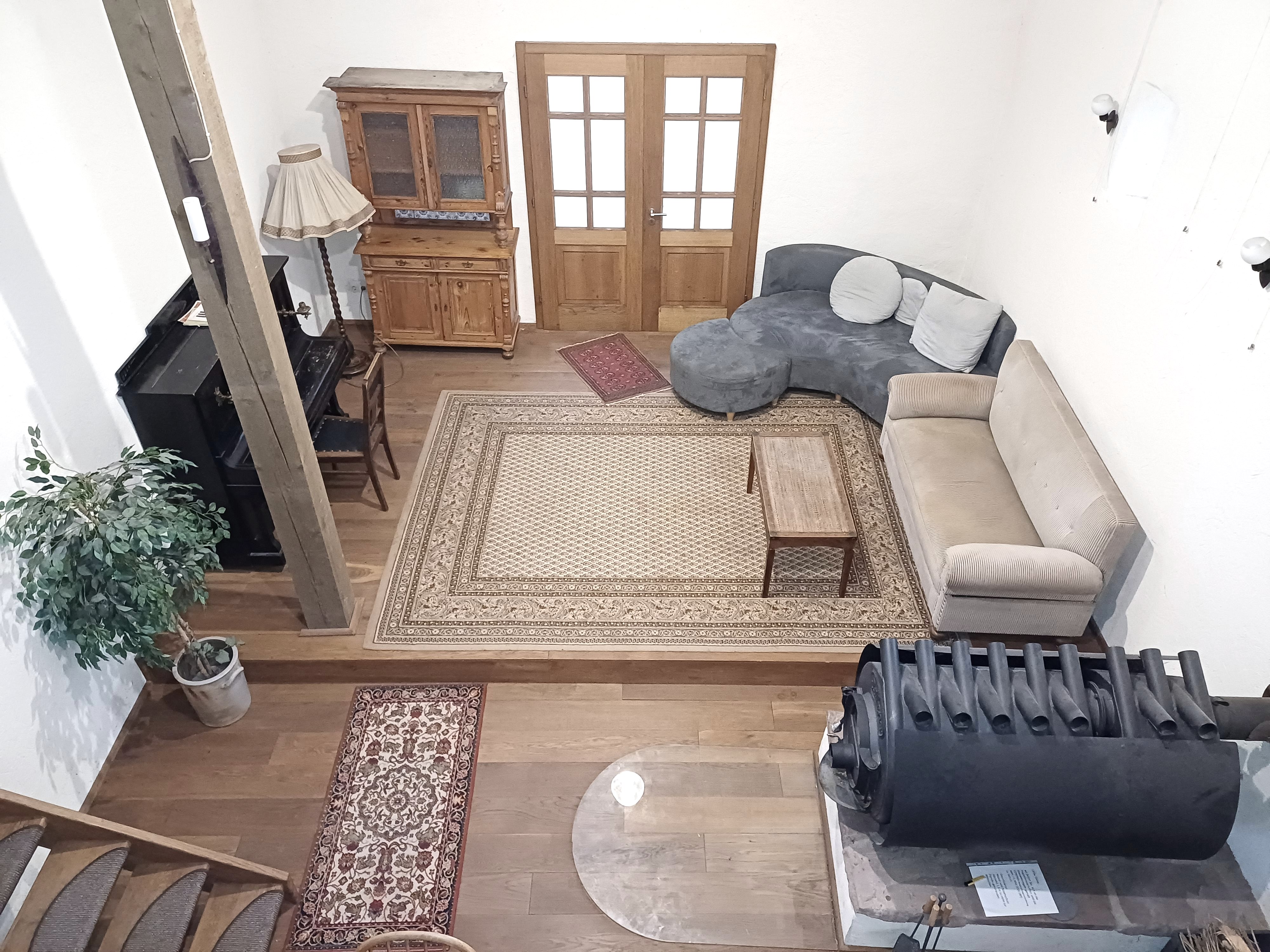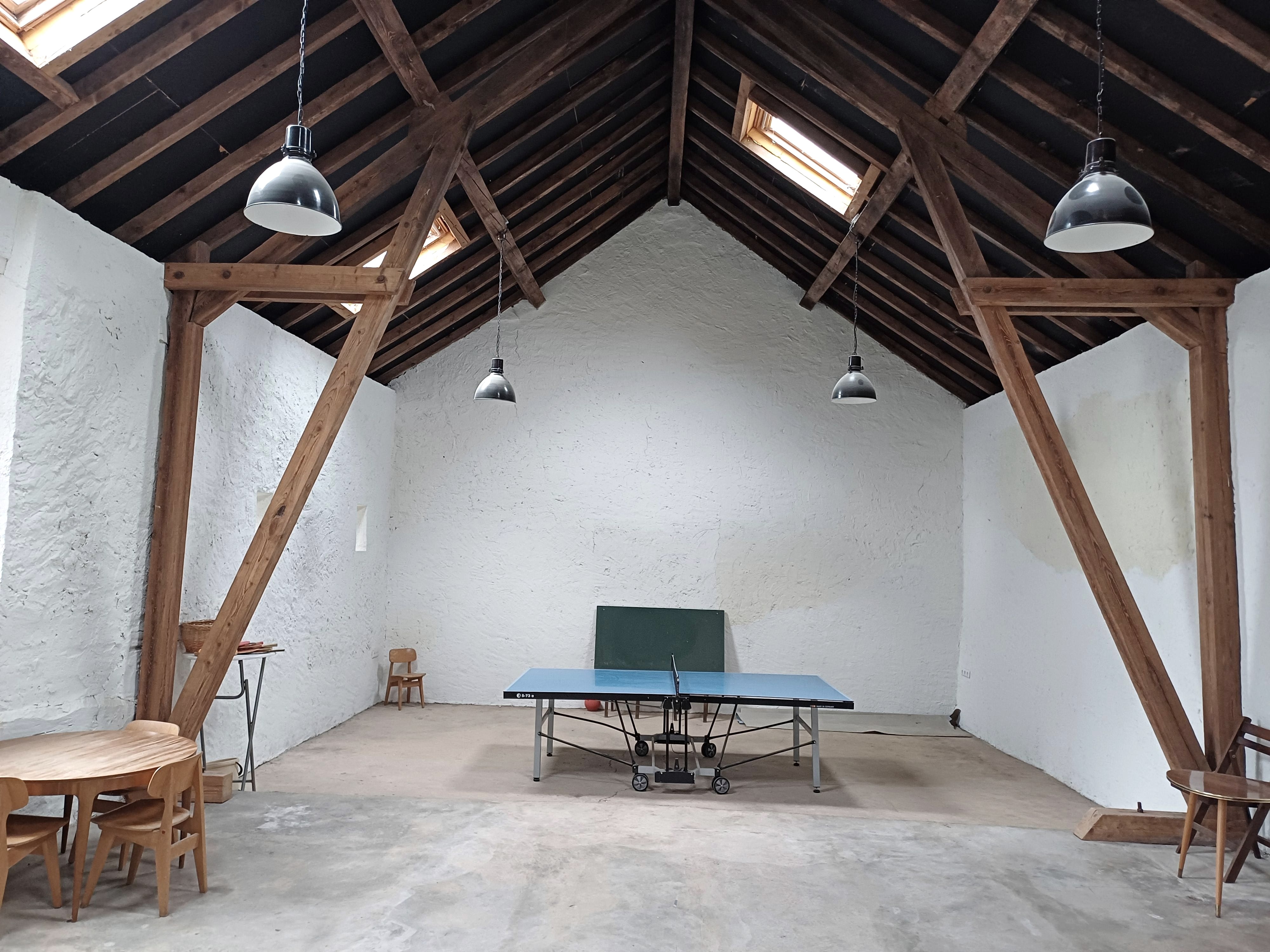The barn can be used as a lounge area. Foosball and ping pong tables invite you to play, while a sofa corner offers a cozy gathering spot. A gallery provides additional space and a large table for gatherings. The garden with barbecue area can be accessed either via the gallery or an external staircase.
