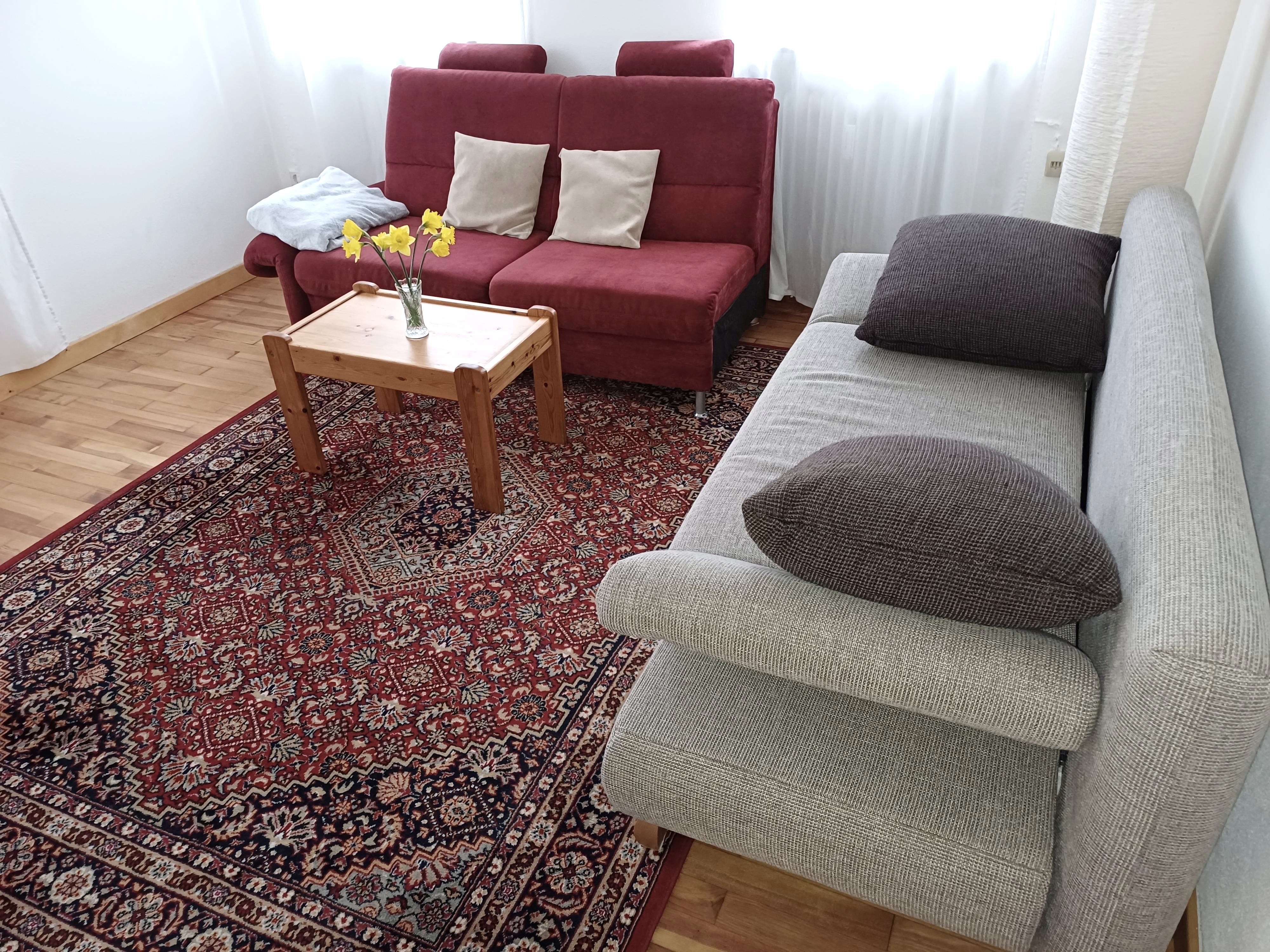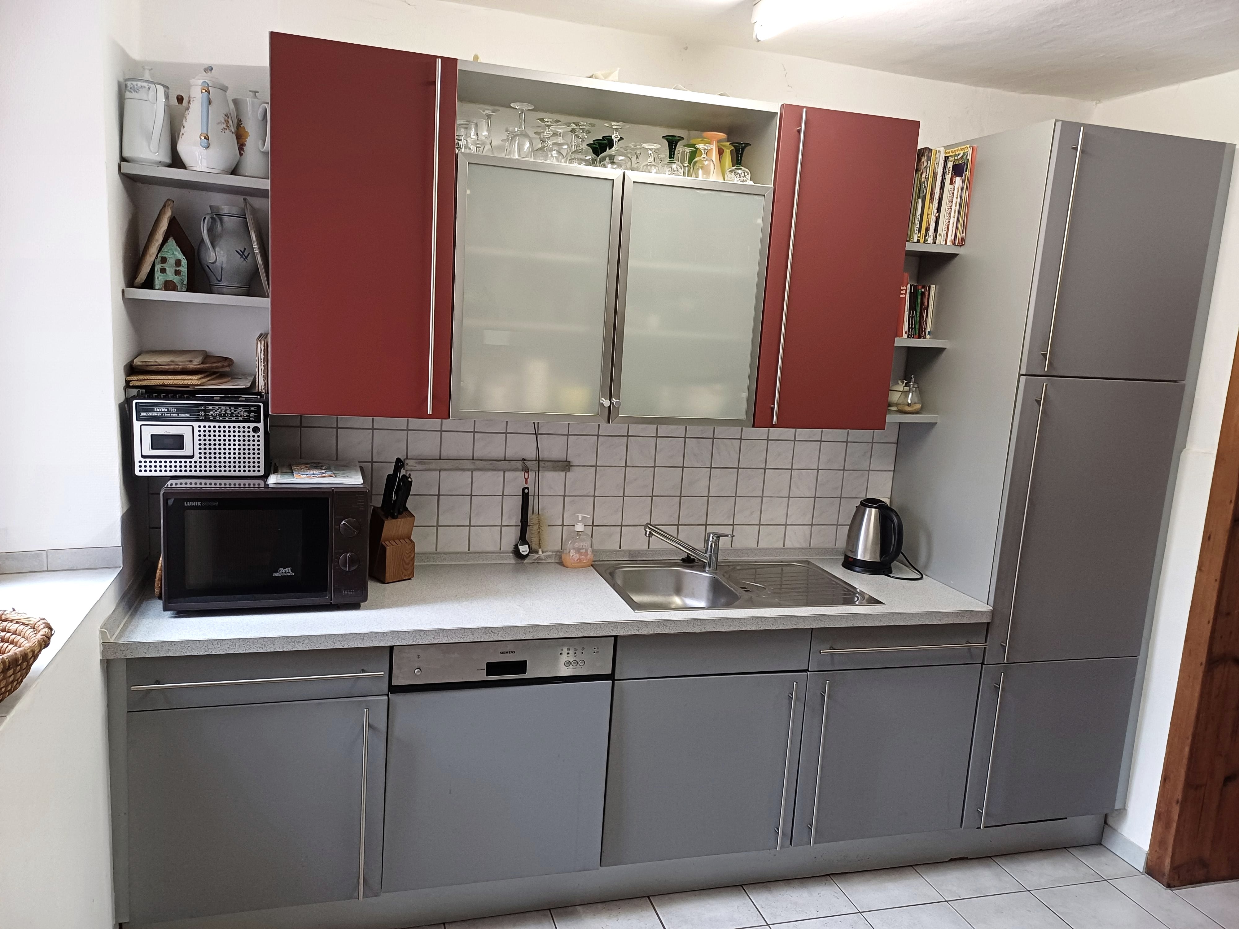 The kitchen is equipped with standard appliances (dishwasher, oven, ceramic hob, microwave, refrigerator). An additional refrigerator with freezer is available. There is a separate dining room with a large dining table and access to the kitchen. The living room is opposite the dining room. A television is located in the built-in cupboard of the living room. Board games and toys for children are available.