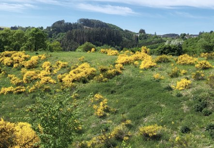Hiking trail through the Ginsterheiden nature reserve with its steppe grasslands, hawthorn bushes and the golden flowering gorse bushes in spring - the Eifel gold.