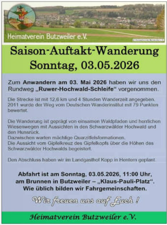 Saison-Auftakt-Wanderung des Heimatverein Butzweiler e.V. +++ 03. Mai 2026 (Sonntag) +++ 11:00 Uhr