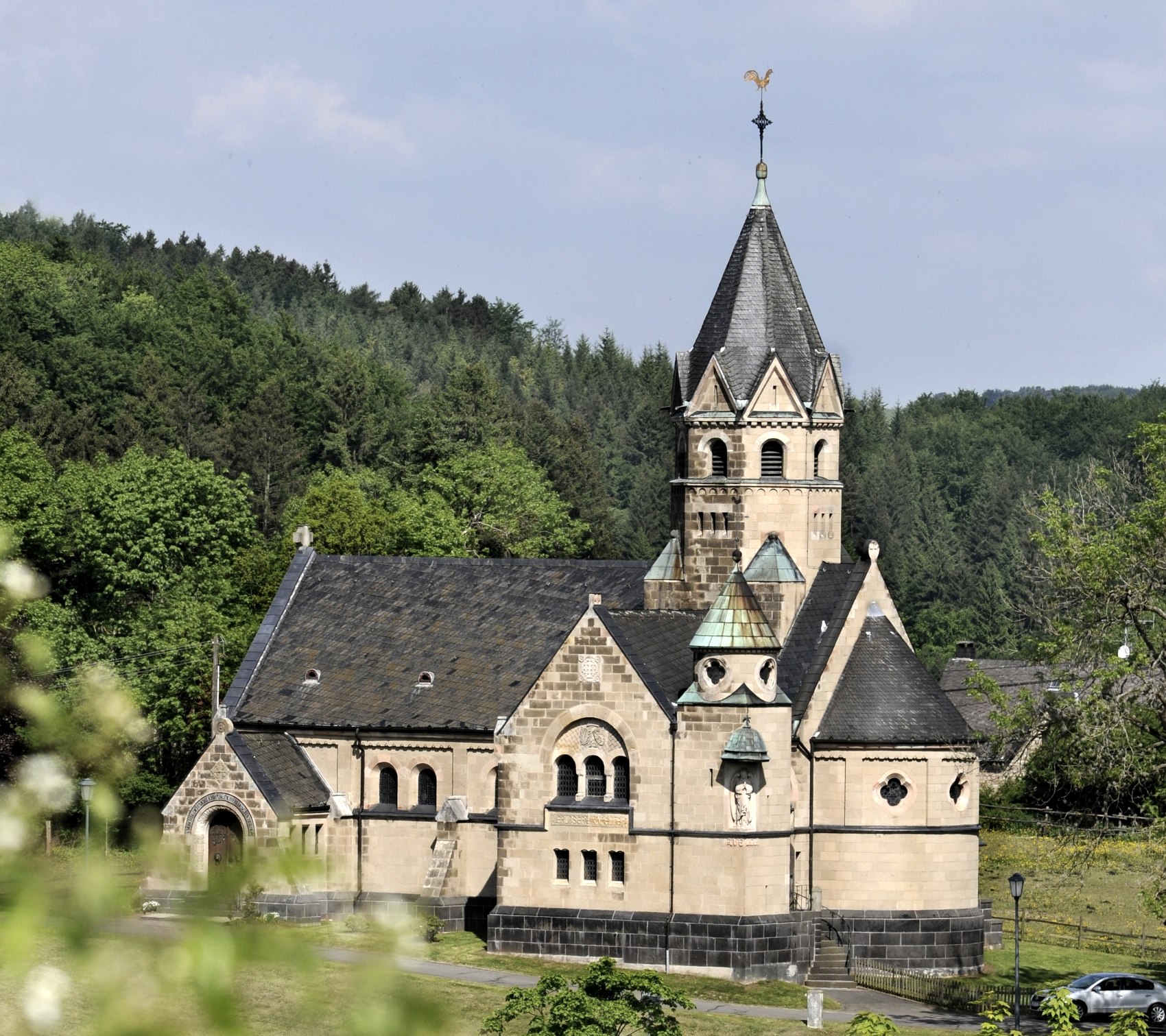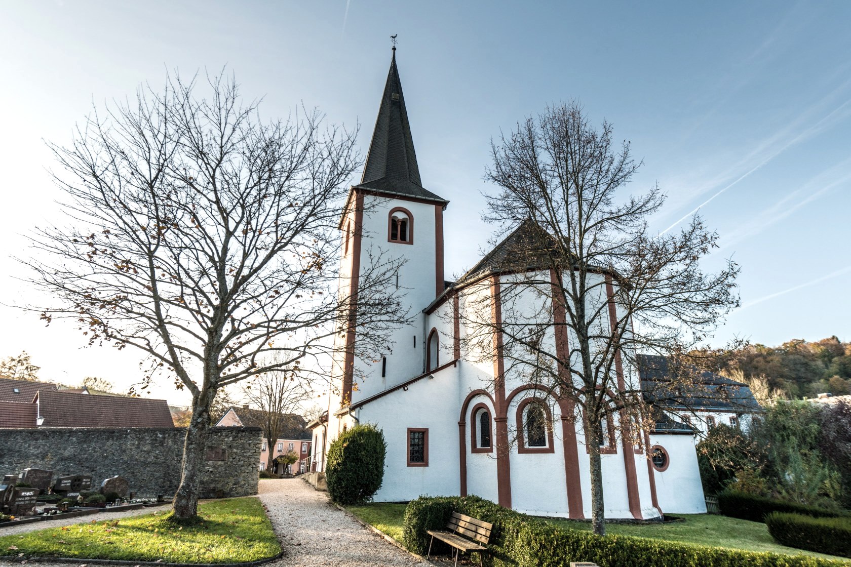 Aujourd'hui, tu commences ta randonnée à l'impressionnante chapelle du Sauveur de Mirbach (un quartier de Wiesbaum) - jette un coup d'œil à l'intérieur et laisse la mosaïque dorée t'impressionner avant de te mettre en route. Tu suis déjà d'étroits sentiers forestiers et des chemins le long des champs et des prairies. Le regard ouvert te montre déjà les premières vues sur le paysage volcanique de l'Eifel.
