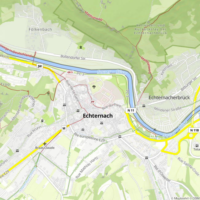 Die frühere Abtei St. Willibrord wurde zur Zeit der Französischen Revolution aufgelöst. Das Abteigebäude, in dem ein Gymnasium untergebracht ist, kann nicht besichtigt werden. Das in den gewölbten Kellerräumen der ehemaligen Abtei eingerichtete Museum ist hauptsächlich dem Echternacher Skriptorium gewidmet.