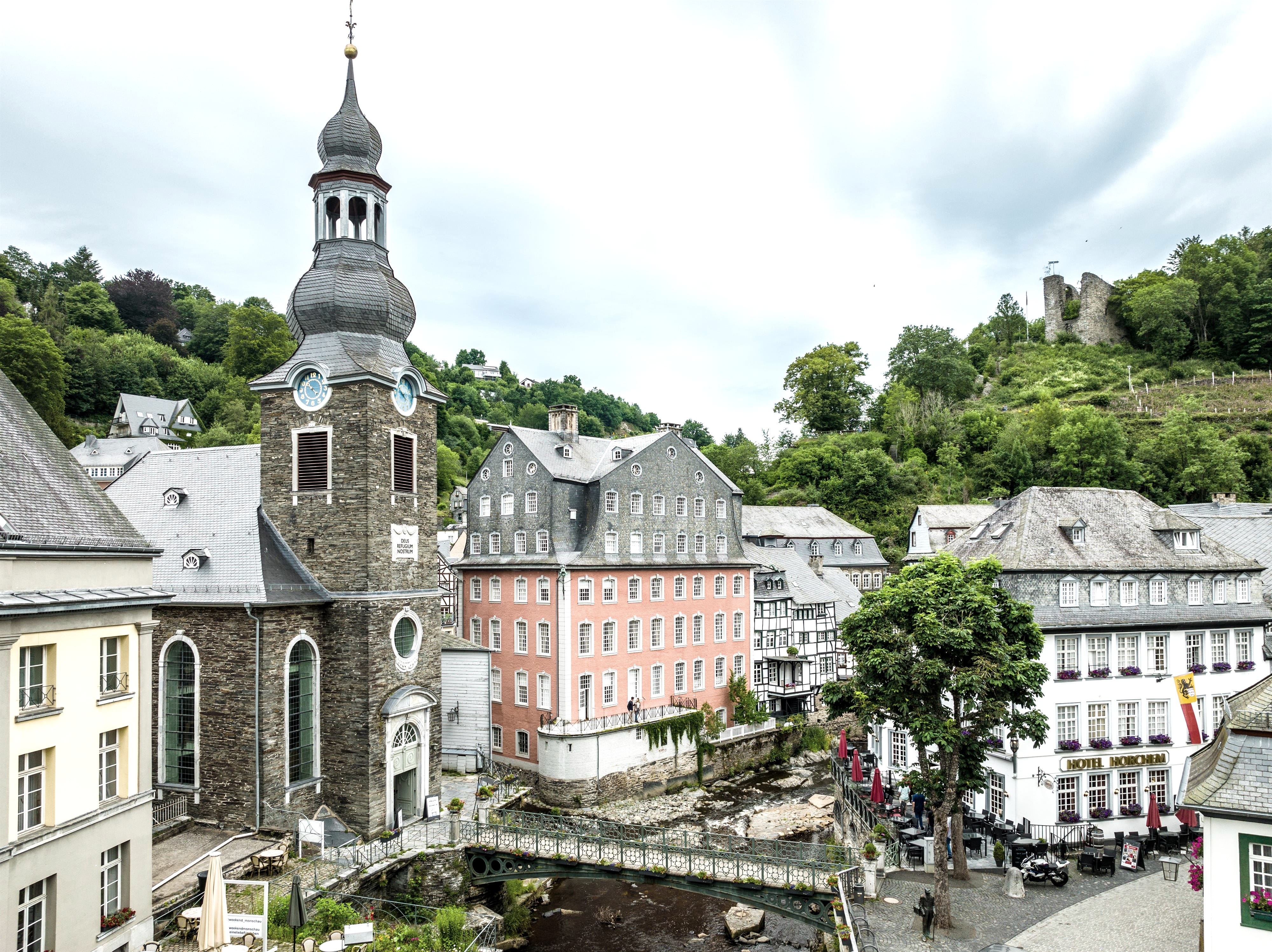 Verkwikt ga je verder naar het doel van deze Eifelsteig-etappe: de lakenweversstad Monschau. Je wordt ontvangen door romantische vakwerkhuizen in het historische stadsgedeelte. Je loopt wat rond en valt voor de verleidingen in de kleine cafés en restaurants. Een specialiteit zijn de 'Monschauer Dütchen' - echt iets voor liefhebbers van zoet. Zelfs een mosterdmolen (met mosterdrestaurant) is hier en een koffiebranderij. Na korte tijd krijgt de betovering van Monschau je in haar greep en met voldoening denk je terug aan je wandeling.