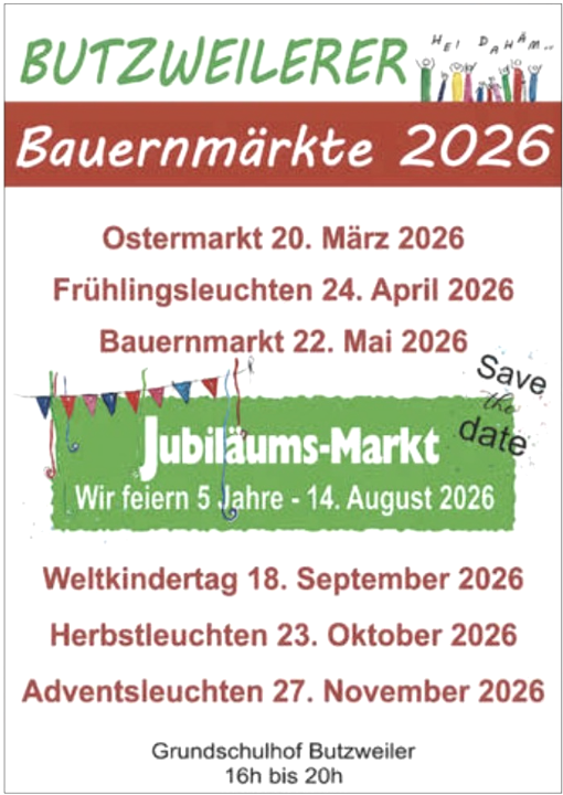 Butzweilerse Boerenmarkten 2026 op het schoolplein van Butzweiler +++ telkens 16:00 - 20:00 uur