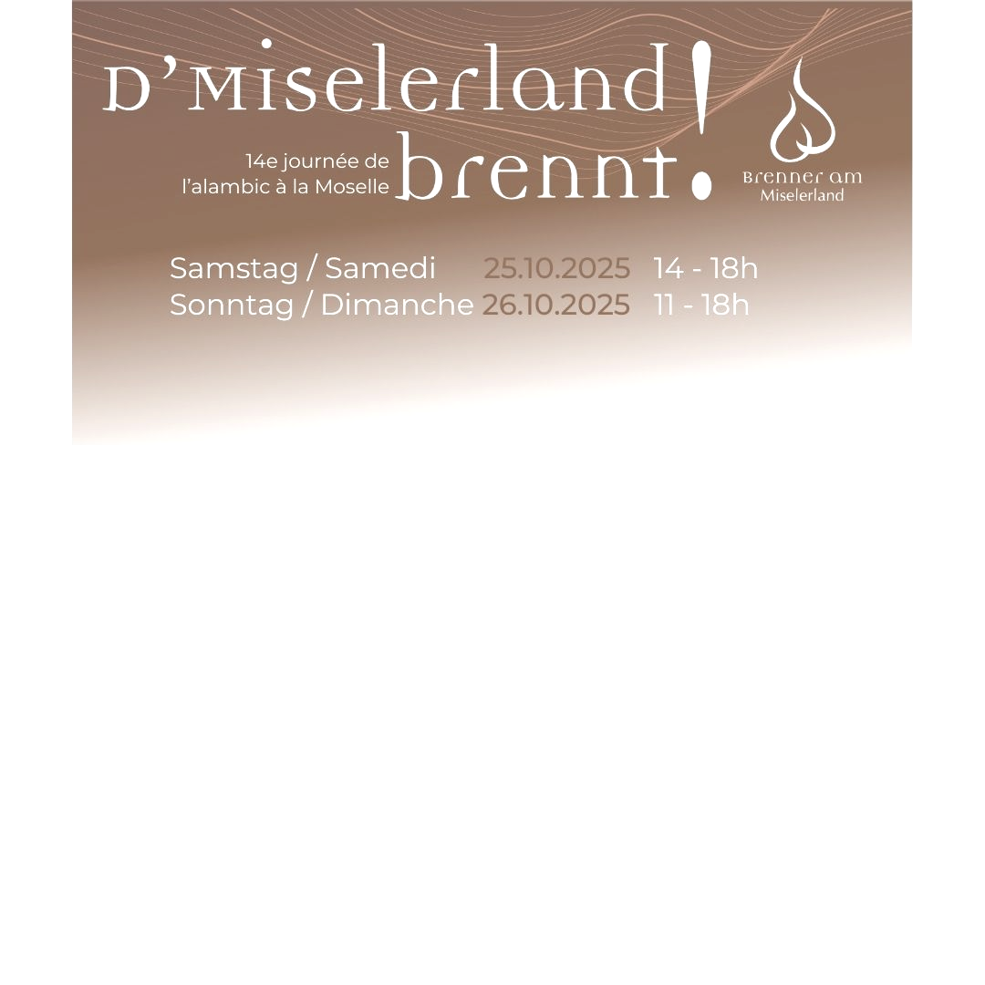 Al meer dan 14 jaar nodigen de Edelfruitbranders aan de Luxemburgse Moezel uit voor hun traditionele Branddag “D’Miselerland brandt!” om de culturele en culinaire rijkdom van hun destillaten te presenteren. Ook dit jaar wordt de Branddag weer grensoverschrijdend uitgebreid en vindt parallel plaats in de Duitse Moezelregio onder het motto “De Moezel brandt!”