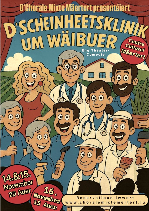 De Choral Mixte Mäertert presenteert de theaterkomedie "D'Scheinheetsklinik um Wäibuer"