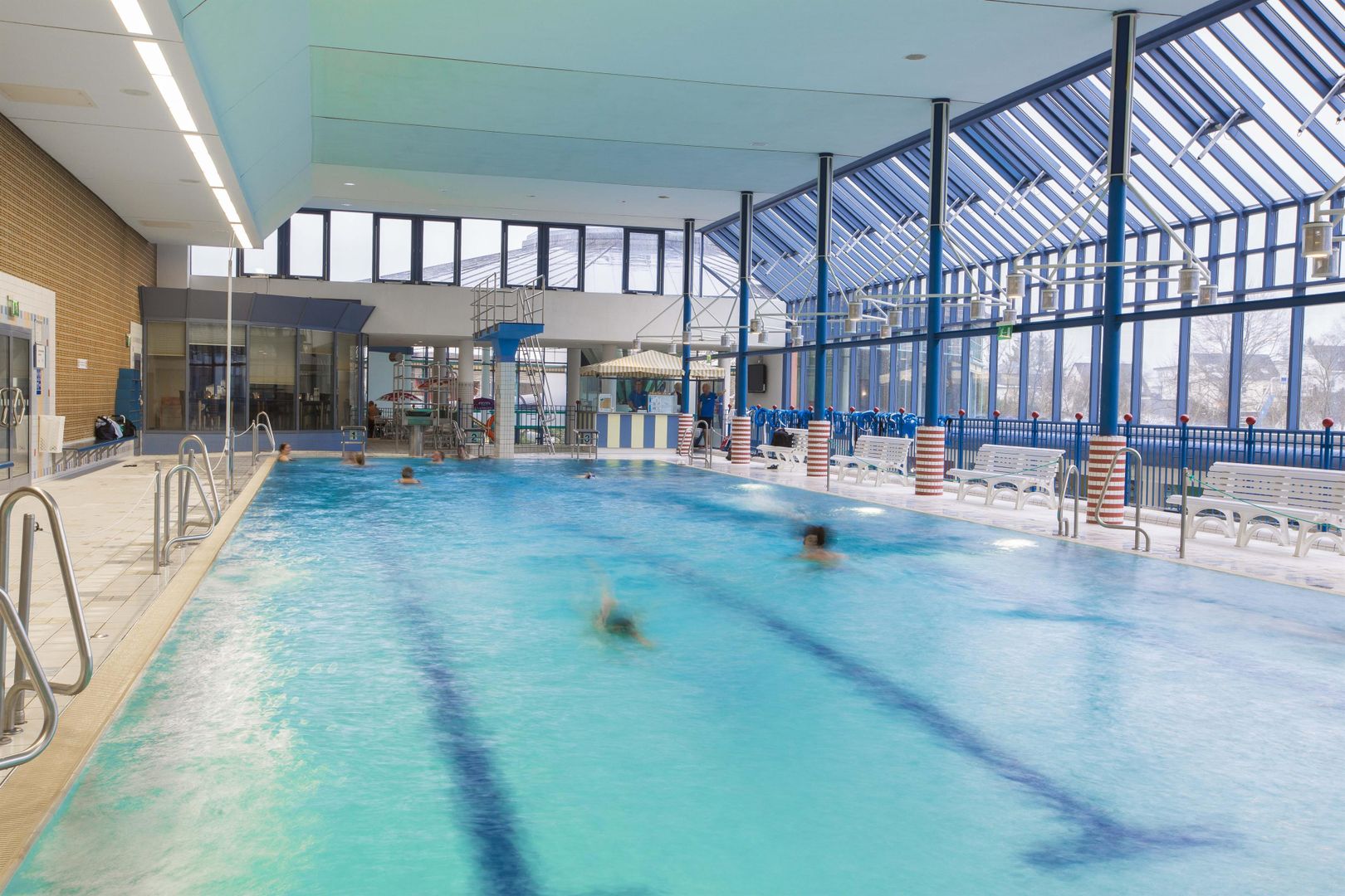 - 50m-Sportbecken und ein imposanter 5m-Sprungturm.