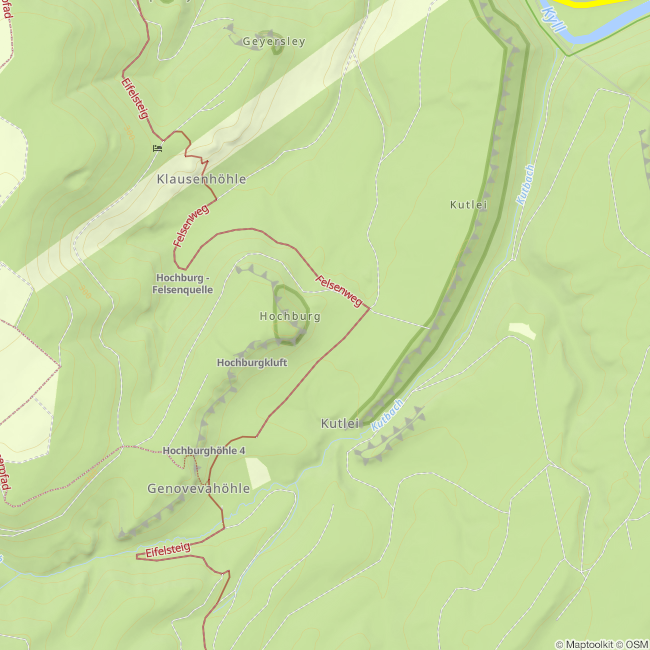 Die Hochburg war zu keltischer Zeit eine Bergbefestigung, die sich ein ringsum steil abfallendes Felsplateau zunutze machte. Dieses erhebt sich rund 90 m über das Kuttbachtal. An seiner hohen Südwand boten Überhänge und Felslöcher in Notzeiten den Menschen Schutz und Unterschlupf, wie etwa die 500 m südwestlich gelegene Genovevahöhle. Die Hochburg selbst gliedert sich in drei Teile: eine langgestreckte Vorburg mit kurzem niedrigem Vorwall und Graben, die durch einen mächtigen, bis zu 5,5 m hohem Abschnittswall mit vorgelagertem Graben gekennzeichnet wird, und die an der Ostspitze vermutlich erst im Mittelalter angelegte Oberburg. Die steile Außenböschung des Hauptwalles sowie einige Oberflächenfunde lassen eine Entstehung der Hauptburg im 5. Jh. v. Chr. vermuten. Steilwandige Felsabbrüche machten eine Randumwehrung entlang der Nordost- und Südseite überflüssig. Der zugängliche Westhang war dagegen künstlich abgeschirmt. Hier läßt eine Wall-Lücke mit leicht versetzten Enden die ehemalige Toranlage erkennen. Die nach Osten vorgeschobene Spitze des Hochplateaus ist von der übrigen Fläche durch einen in der Mitte unterbrochenen und zu einem Graben verbreiterten Felsspalt abgetrennt. Hinter dem Felsgraben wurden verschiedentlich Spuren von Mörtelmauern sowie hochmittelalterliche Scherben gefunden, die möglicherweise Bezug auf eine für das Jahr 926 n. Chr. urkundlich überlieferte Bauanlagen nehmen. Vom höchsten Punkt der Spitze überblickt man nicht nur das Kylltal, sondern bei gutem Wetter auch die Höhen des südlichen Moselufers bis hin zu den ansteigenden Bergen des Hunsrücks.