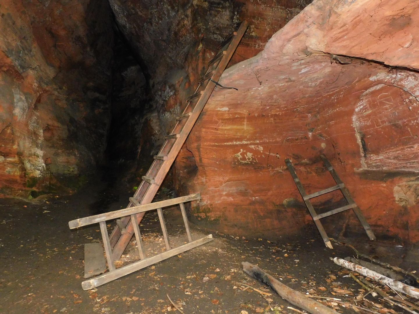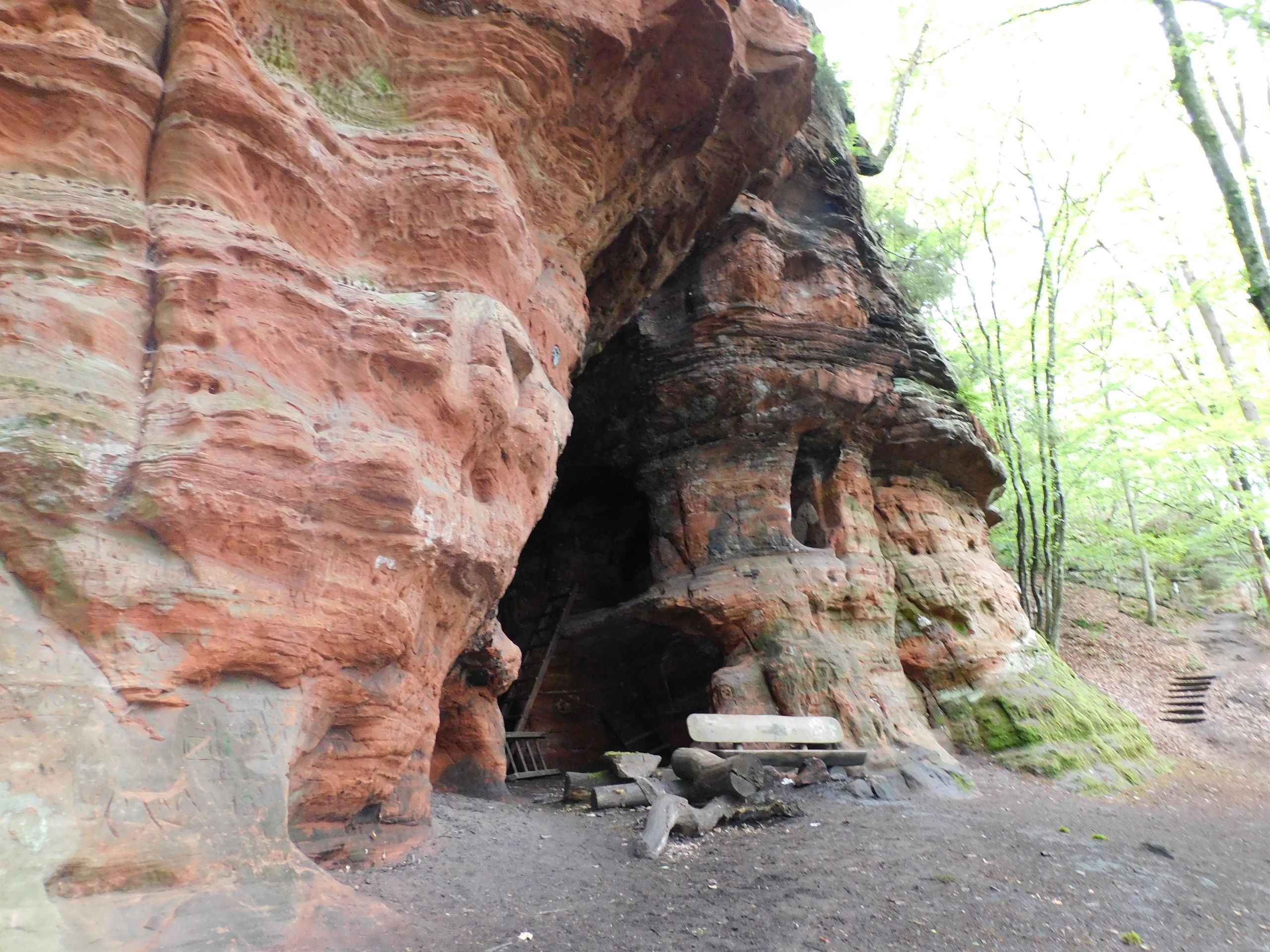 An der Ostseite der Höhle befindet sich eine Ausgrabung mit einem Loch in der Felsaußenwand. Erkennbar ist, dass mit Hammer und Meißel nachgearbeitet wurde. Ein geschützter Schlafraum bot sich dadurch an. Die Nische unter diesem Etagenraum war sicherlich zu einem Andachtsraum hergerichtet. In der Fensteröffnung der Etage sowie außen an der Westseite sind primitive, entfernt an Totenmasken erinnernde Gesichter erkennbar. Sie dienten wohl exorzistischen Zwecken. Böse Geister sollten ferngehalten werden.