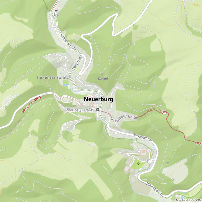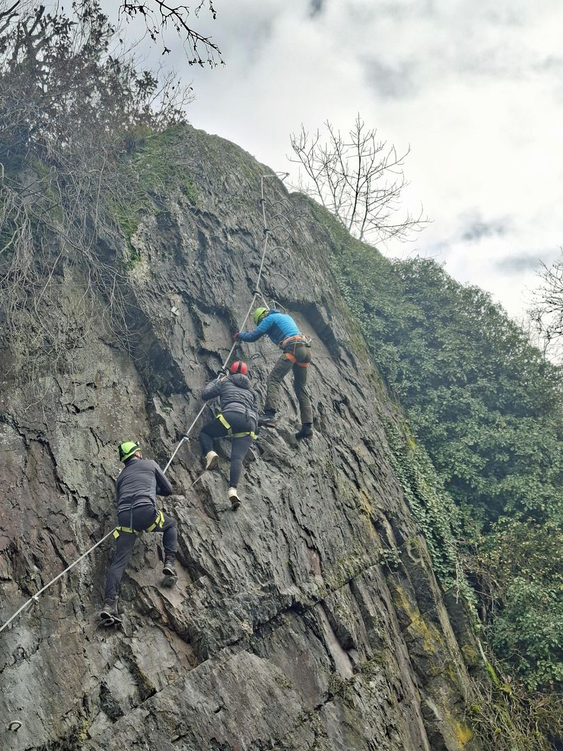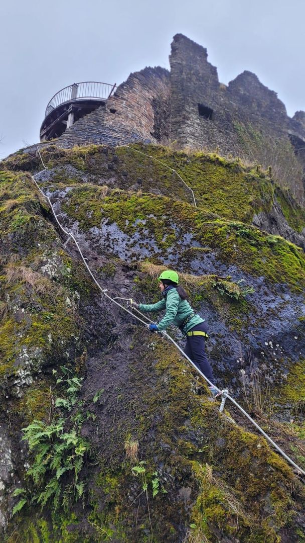 Der Klettersteig Neuerburg verfolgt dabei einen ganz eigenen Ansatz: Die Rundroute nutzt die bestehende Wanderwegeinfrastruktur und verknüpft Teilstrecken des Premium-Wegs „Neuer-Burg-Weg“ und eines lokalen Wanderwegs mit Kletterpassagen an sechs ausgewählten Felspartien, die spektakuläre Blicke auf die Stadt bieten.