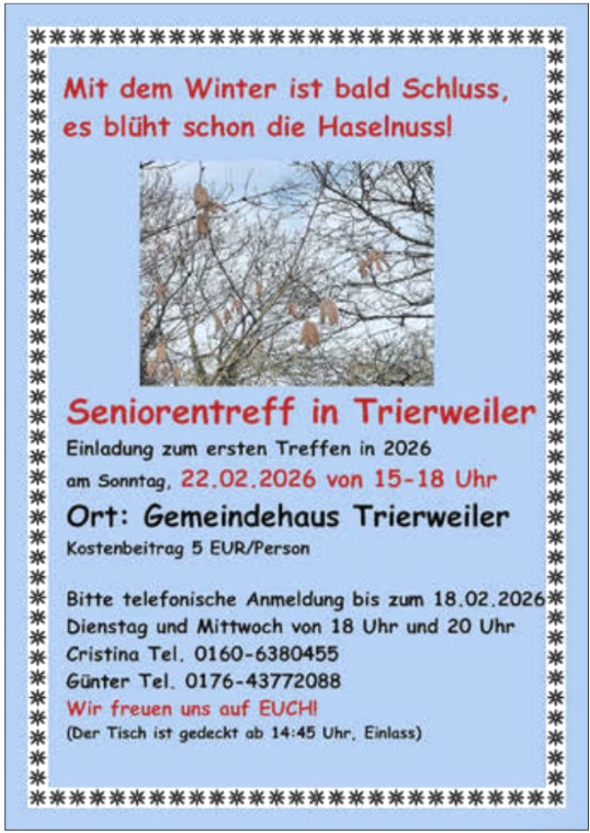 Kostenbeitrag 5 EUR/Person - Bitte telefonische Anmeldung bis zum 18.02.2026 - Dienstag und Mittwoch von 18 Uhr und 20 Uhr
