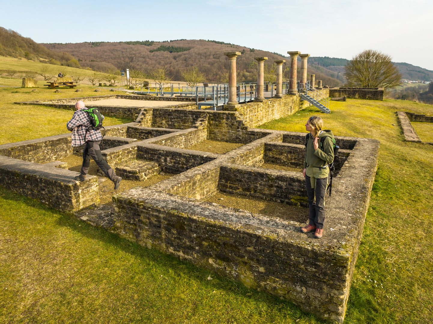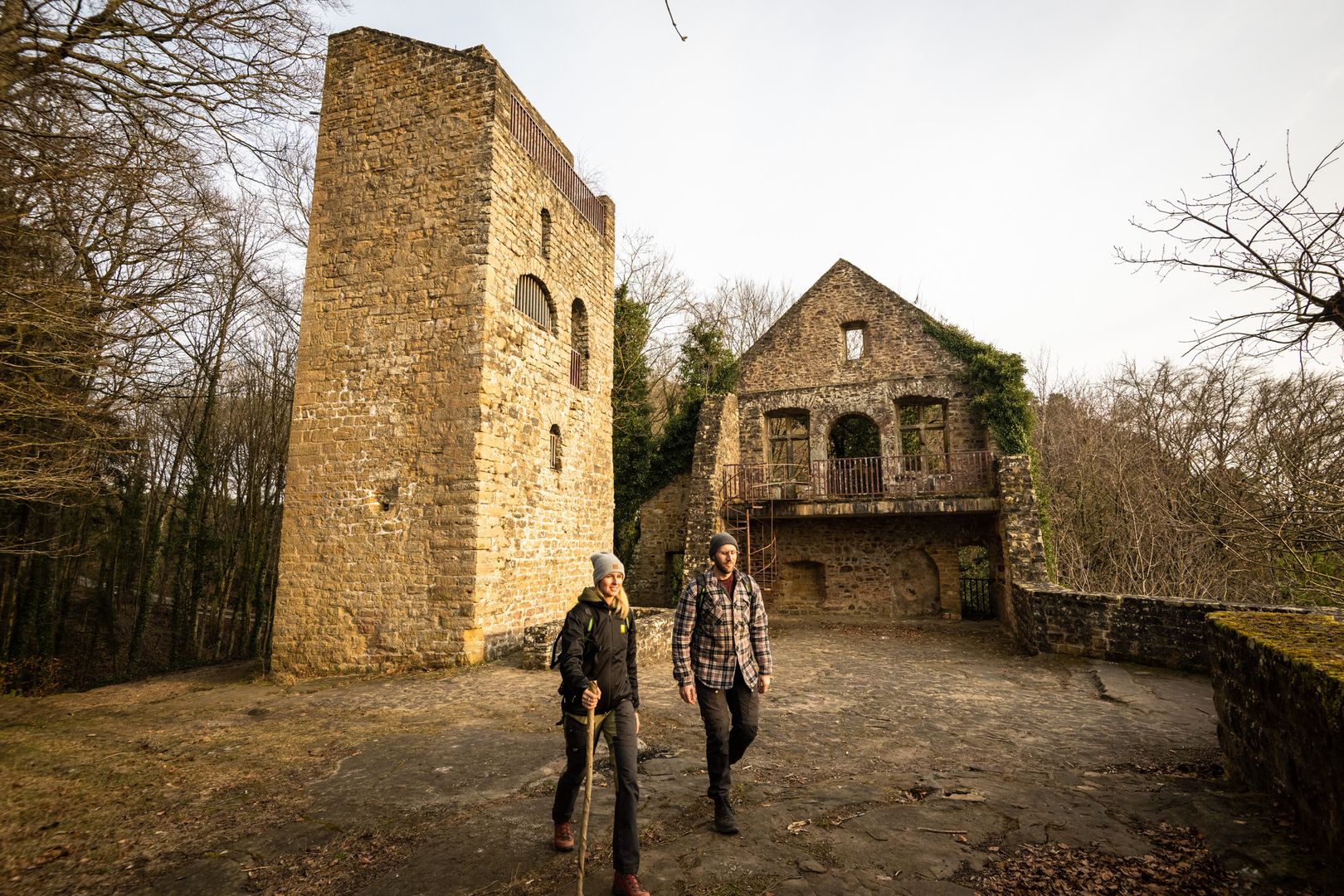 Lasst euch berauschen vom Duft frisch gemähter Wiesen und der Wärme des sonnengefluteten Tals. Schon die Römer fühlten sich hier wohl! Das belegen die Überreste der römischen Villa rechts des Weges. Oberhalb von Prümzurlay stoßt ihr dann auf die Ruinen der Prümer Burg, die „uralte Burg zur Layen“. Erklimmt den fünfeckigen Wehrturm und belohnt euch mit dem fantastischen Ausblick übers Prümtal – ein herrliches Fotomotiv! Von hier aus geht es gemütlich durch lichten Hangwald wieder zurück zu den „Irreler Wasserfällen“.