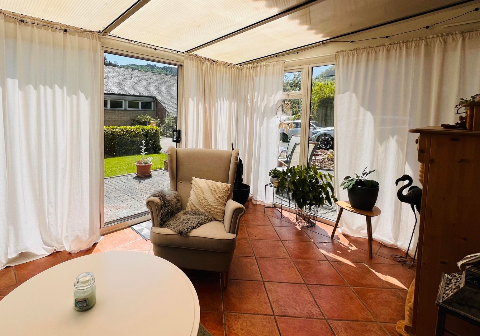 Auf der Terrasse, die mit einer Markise beschattet werden kann, darf im Sommer gerne gegrillt werden. Ein Highlight der Wohnung ist der liebevoll eingerichtete Wintergarten, der mit kleinem Sofa, Sessel und kleinem Tisch zum Entspannen einlädt.