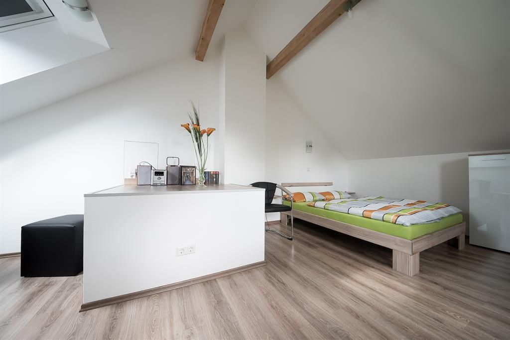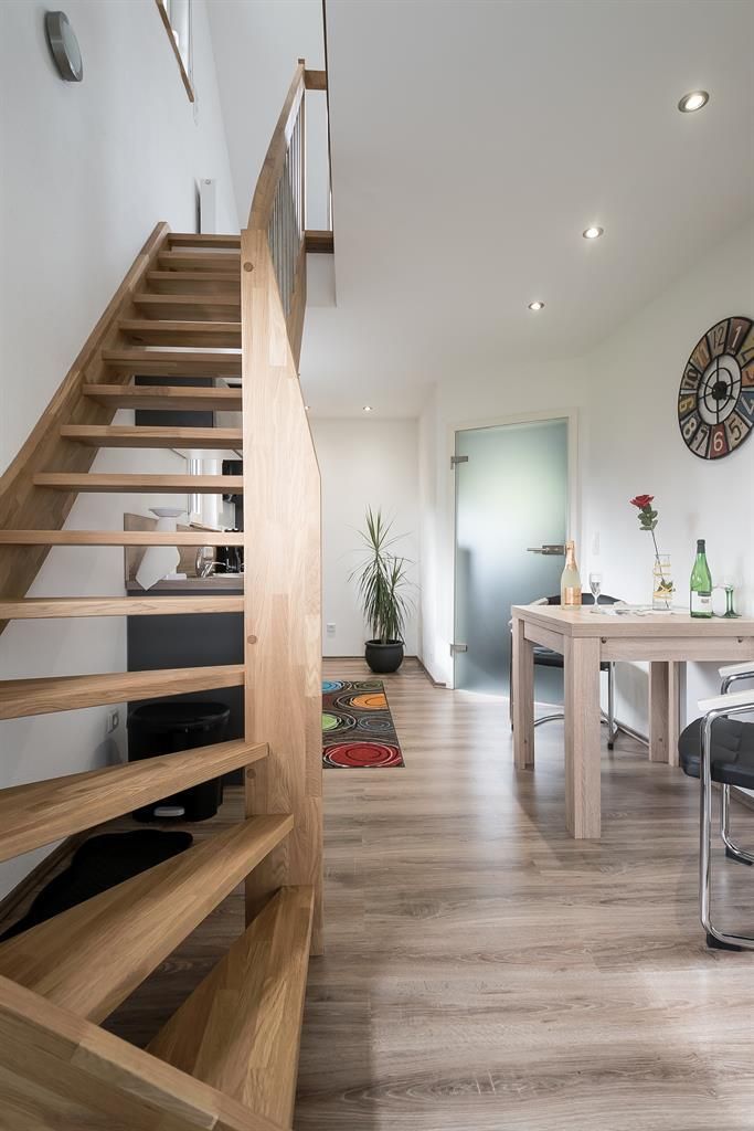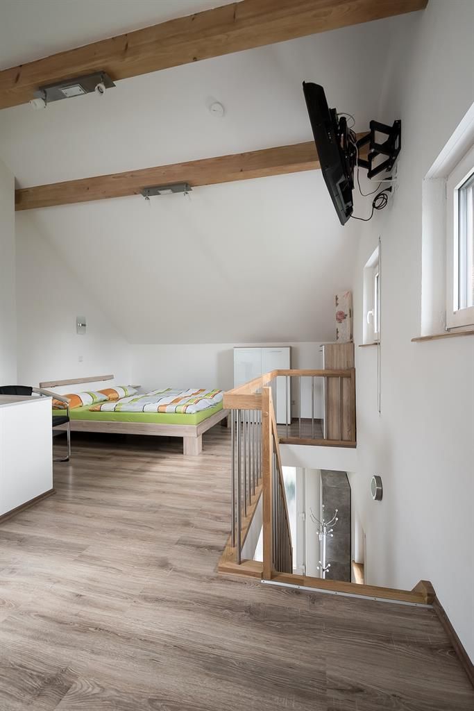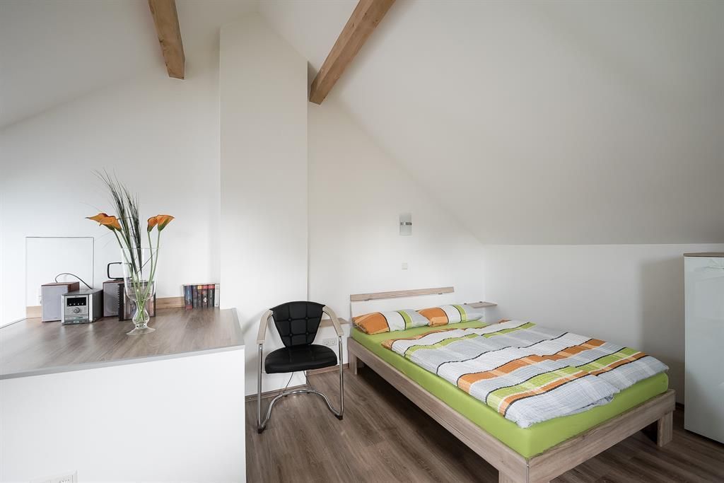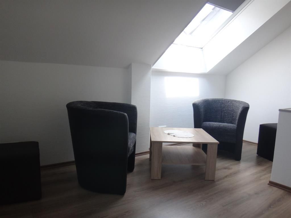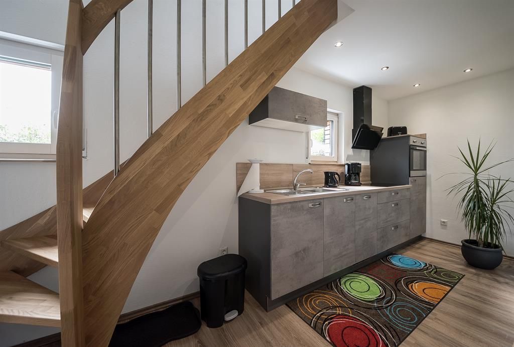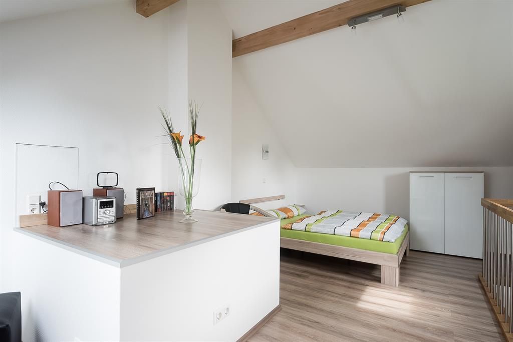 Kombiniertes Studio über 2 Etagen mit Einbauküche mit Sitzgelegenheit und Dusche/WC im unteren Bereich, in der ersten Etage Schlafebene mit französischem Bett, 2 Sessel, Hocker und Tisch sowie Flachbildschirm.