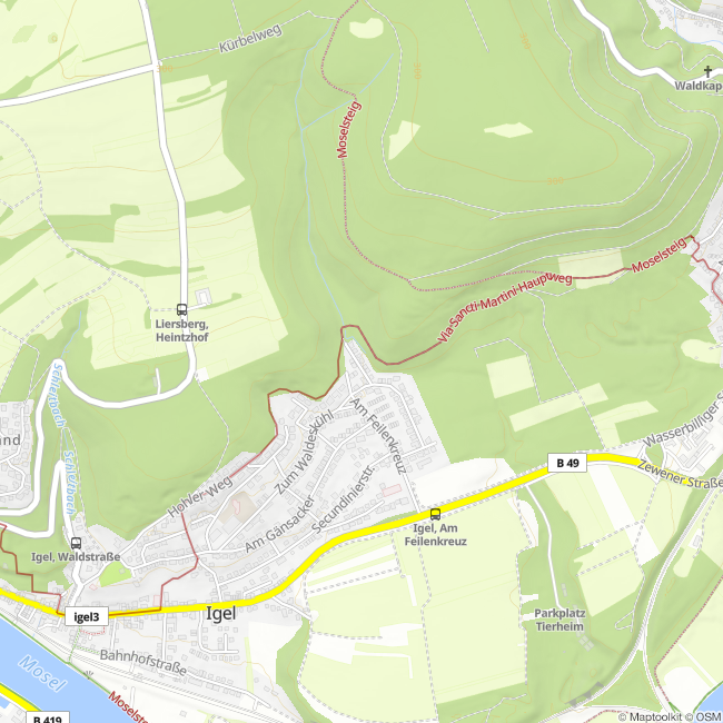 An der Haustür beginnen markierte Wanderwege. Bei Bedarf steht Ihnen ein Wanderführer für Touren in Igel zu Verfügung, natürlich, „kostenlos“. Die Radwege entlang der Mosel sind etwa 1,5 km, ca. 4 km Saar und Sauer ca. 5 km lang. Touren für Mountainbiker starten auch vor der Haustür. Es ist etwa 7 km vom Zentrum bis nach Trier, Luxemburg Grenze etwa 4,5 km und Luxemburg-Stadt ca. 30 km.